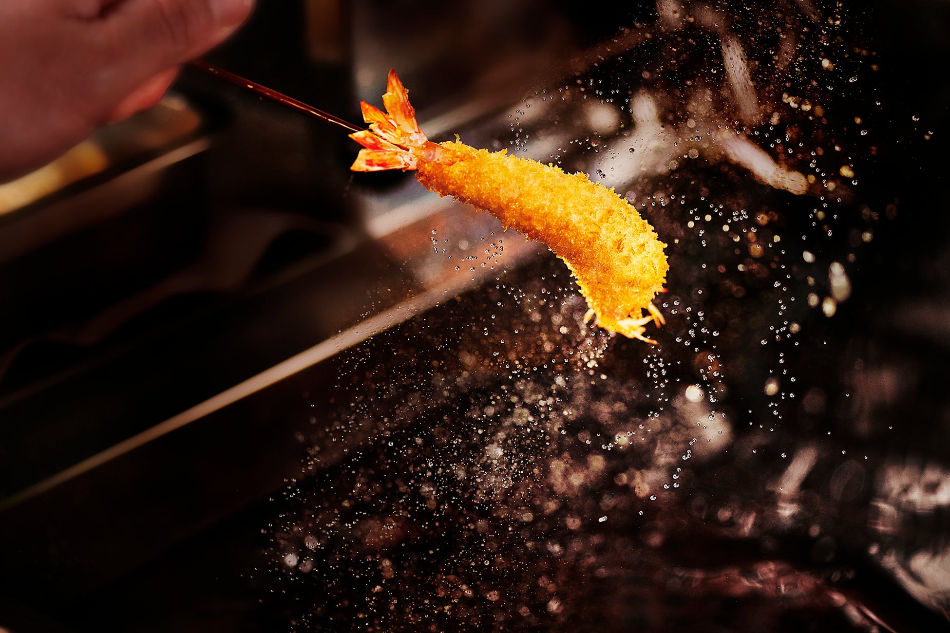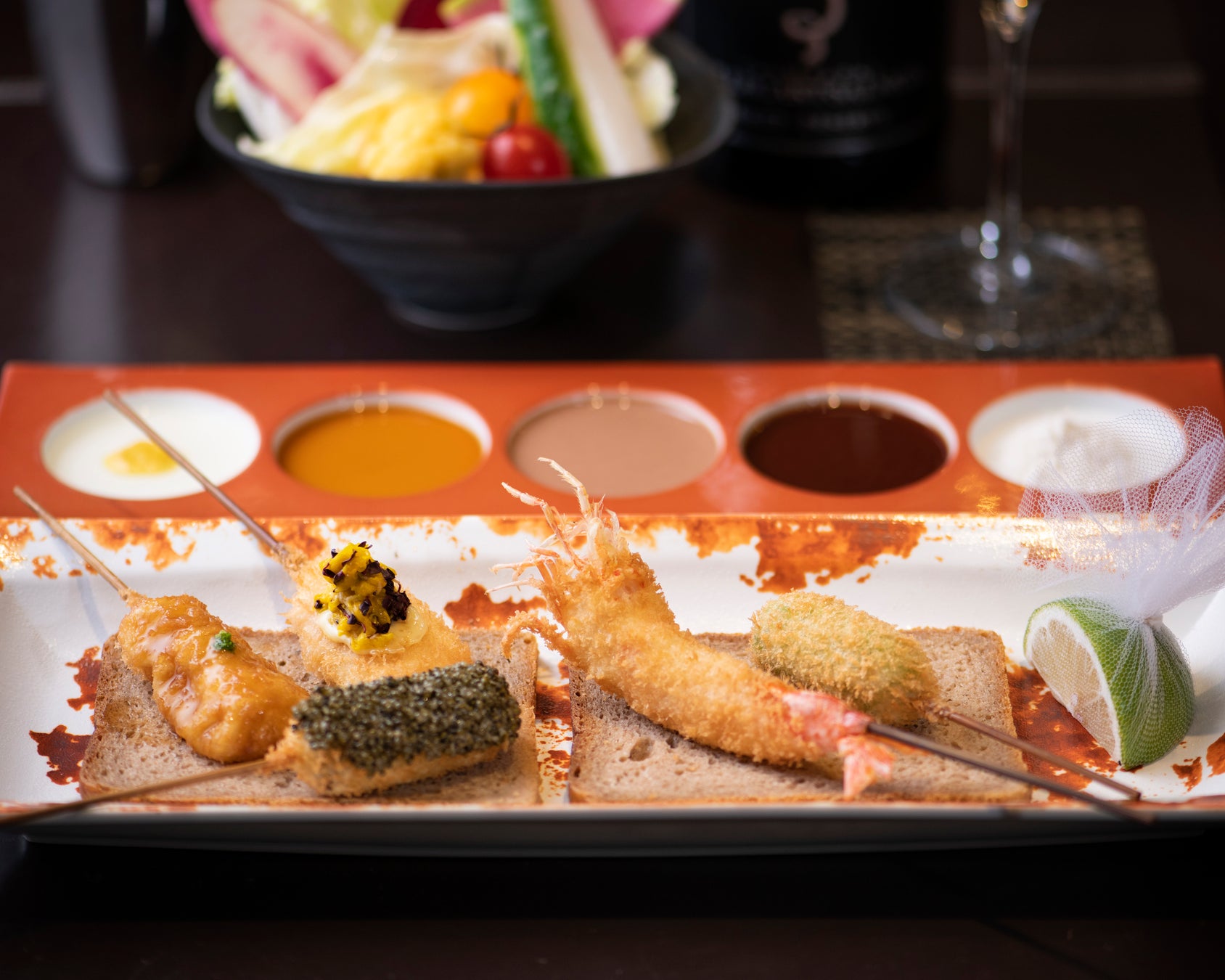 串揚げは、その時期の旬の食材を日本各地から厳選して取り寄せ、職人が一本一本丁寧に仕上げ。5種のソースとともに味わう串揚げとワインによりマリアージュで、五感を刺激する驚きの美味しさをお届けしています。