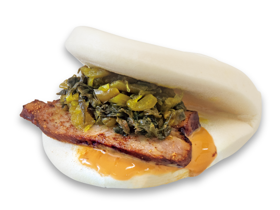 蒸しパンに豚肉、ピーナッツペースト、高菜をサンドしました。