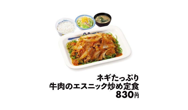 商品名 ネギたっぷり牛肉のエスニック炒め定食 830円 ※お持ち帰りいただけます。お持ち帰りにみそ汁は付きません。 お持ち帰りの場合、みそ汁は別途60円でお求めいただけます。 ※税込み価格です。 ※株主優待券は上記メニューにご使用いただけます。 発売日 2024年4月9日(火)午前10時 ~ 対象店舗 一部店舗を除く全国の松屋 |