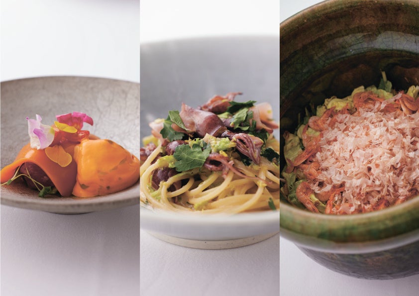 各店舗のシェフが、本コラボのために、「にんべん 日本橋本店」の「本枯鰹節 削りたて」を使ったメニューを考案しました。