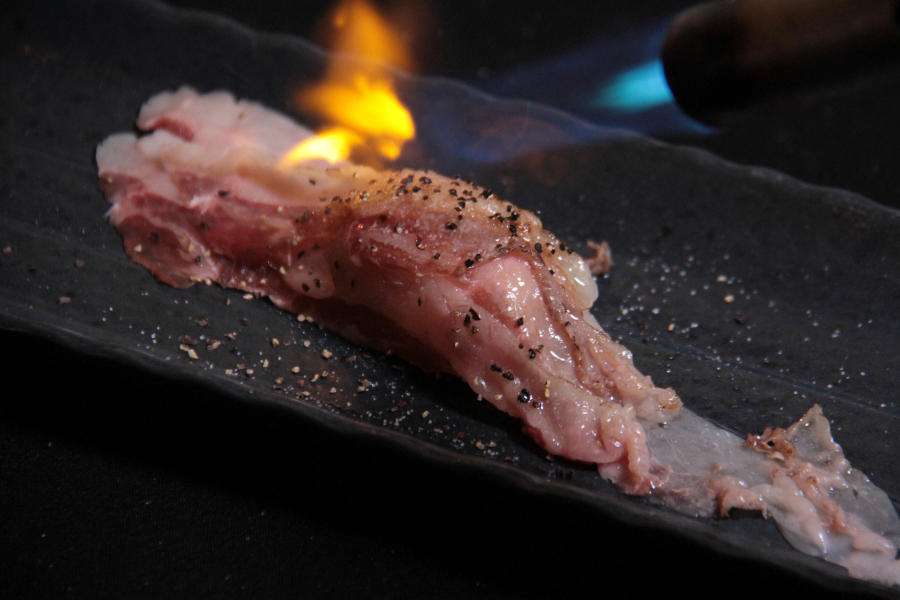 トモバラは、赤身と脂が交互に層になっていて濃厚な風味が特徴の上質なバラ肉です。上品な脂の甘みをお楽しみください。馬肉の中でもジューシーな部位なので、お米と相性がよいことから、肉寿司風に仕上げております。炙ることでさらに旨味の広がる部位なので、お客様の目の前で炙って完成です。お好みでわさびを付けてお召し上がりください。