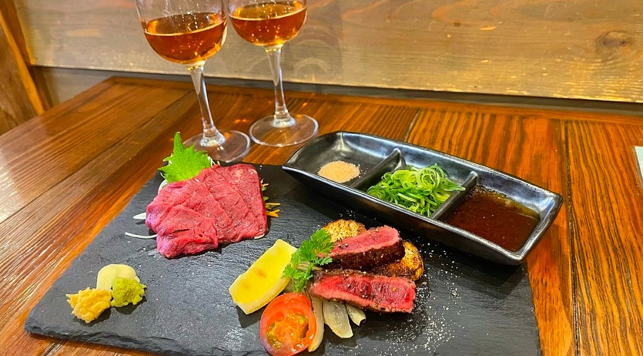 当店では、2024年4月4日(木)から2024年4月30日(火)の期間限定で、春にぴったりの桜肉=馬肉の限定盛り合わせとロゼワインの提供を開始します。肉の色が桜色であることから別名、「桜肉」と表現される馬肉は、桜の咲く季節が旬といわれています。限定商品の「純国産馬肉のモモステーキとモモ刺しの盛り合わせ」では、この時期に一番美味しい馬肉の食べ比べをお楽しみいただけます。