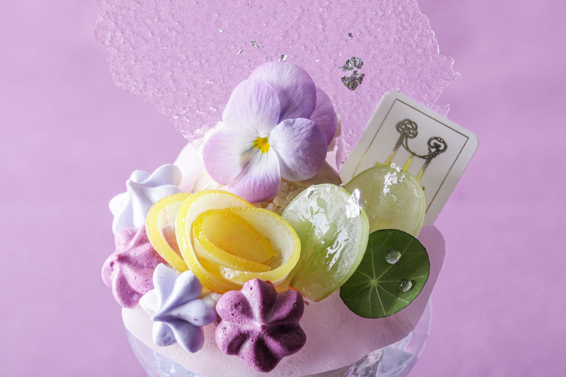 下段には、紫陽花カラーを再現した“バタフライピー寒天”や白ワインとレモンのジュレ、ミルクアイスやホワイトチョコレートのクランチを使用。最下部にはシャインマスカットを取り入れ、最後の一口まですっきりとお召し上がりいただけます。
