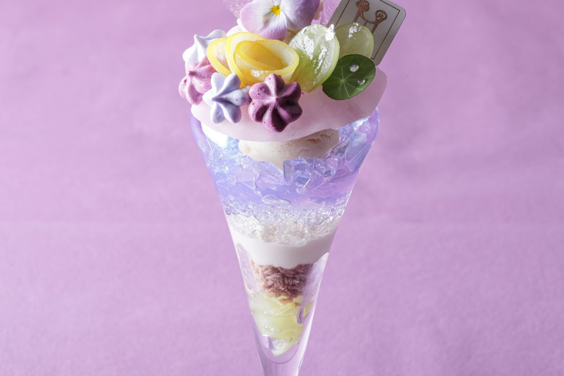 ホテル開業より大人気スイーツの“大人のご褒美パフェ”。上段と下段で構成され、アーティスティックな見た目が、ご褒美感満載な大人気スイーツ。第56作品目の今回は、季節感満載の“紫陽花”がテーマ。色鮮やかで美しい紫陽花の見た目を表現しつつ、上段と下段を隔てる“ピンクカラーの求肥”が傘や雨合羽のようにも見える、キュートな一面も持ち合わせた特別なひんやりスイーツに。