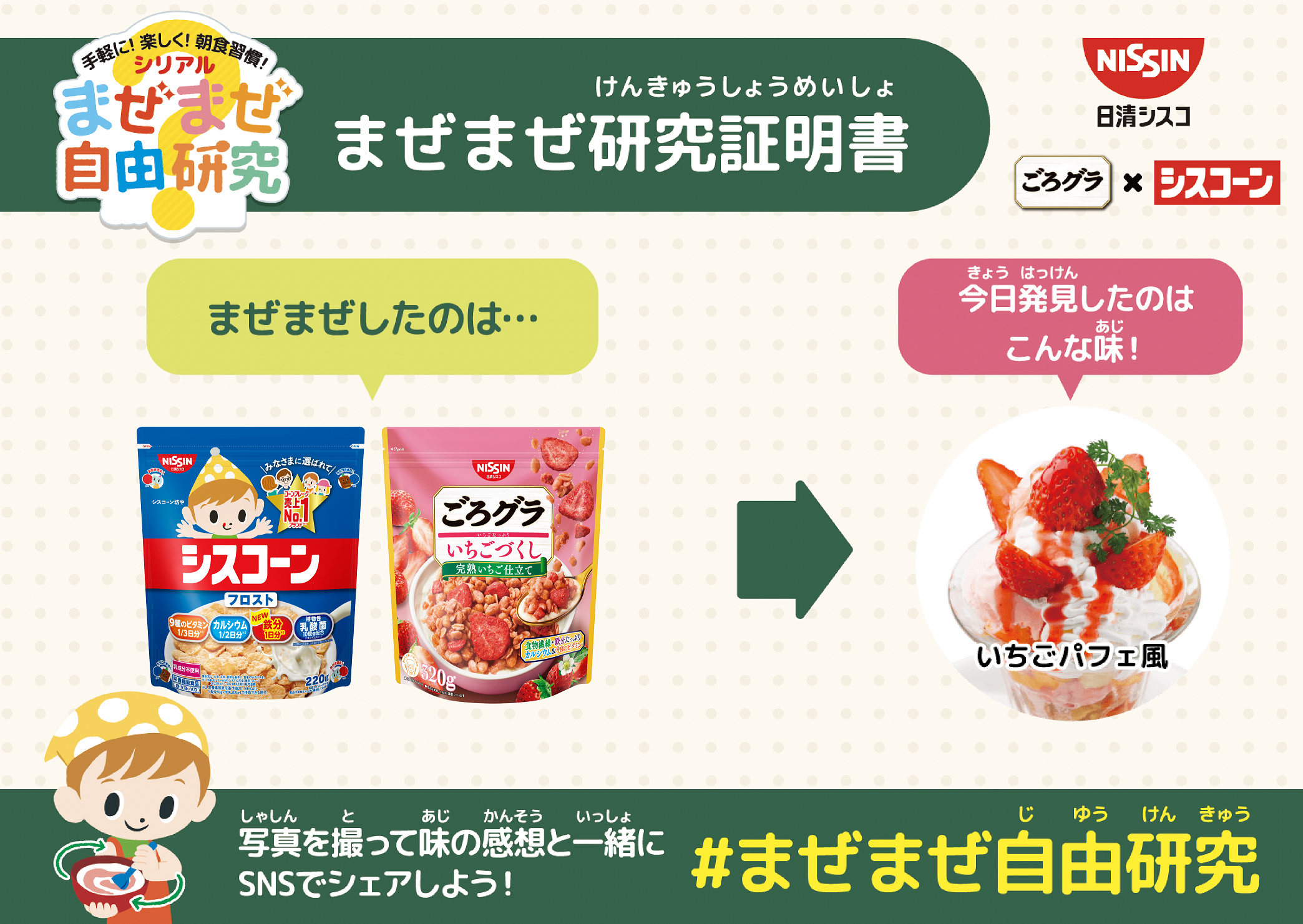 また、開発したレシピは「まぜまぜ研究証明書」に記載し、レシピを記録することもできますので、この機会にバリエーション豊富な「ごろグラ」と「シスコーン」をまぜまぜして、あなただけのオリジナルレシピを発見してみてはいかがでしょうか。