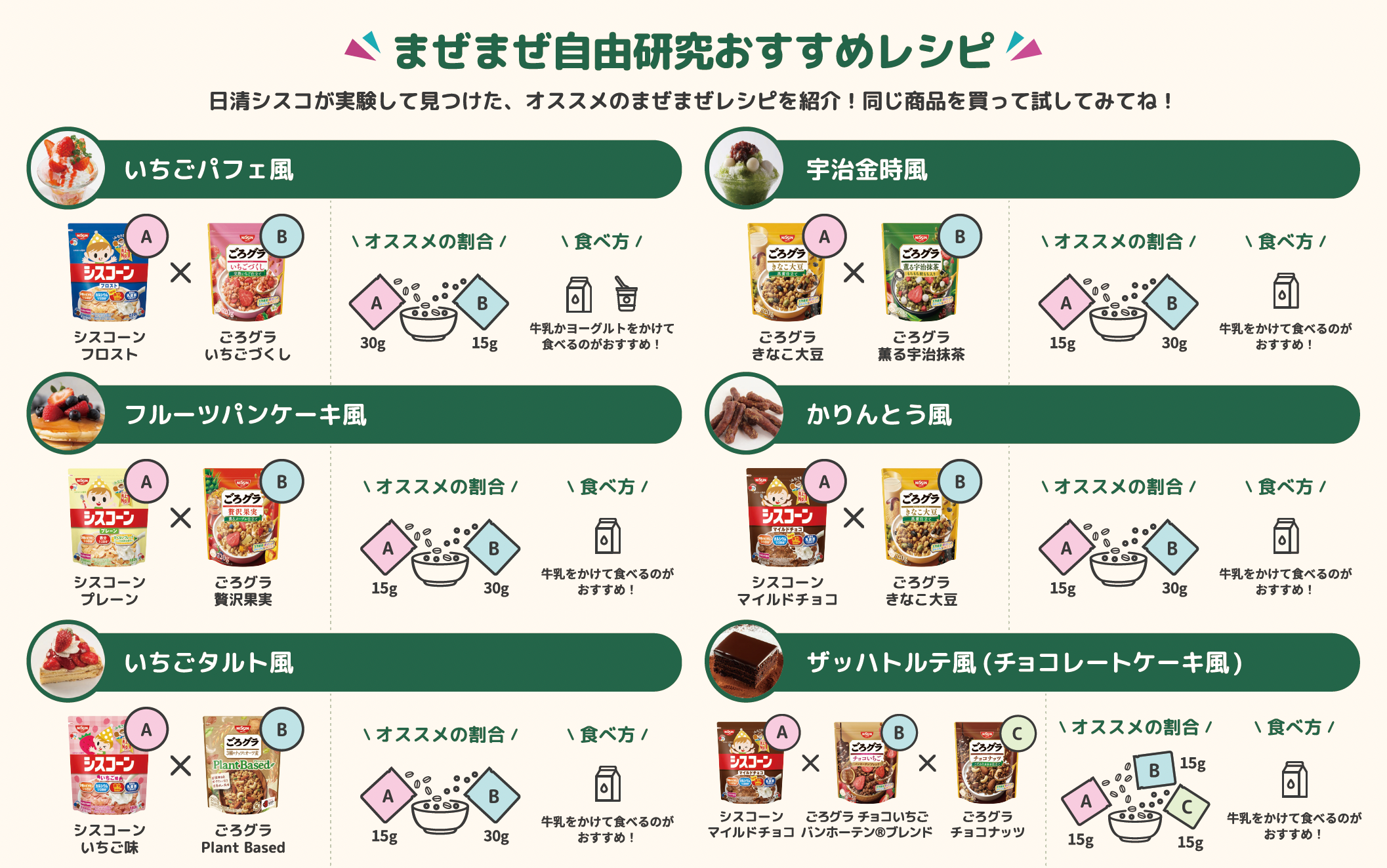 イベントでは、「ごろグラ」7種類と「シスコーン」6種類の計13種類を用意しておりますので、好きなシリアルをまぜて、オリジナルのレシピを開発・試食していただくことが可能です。