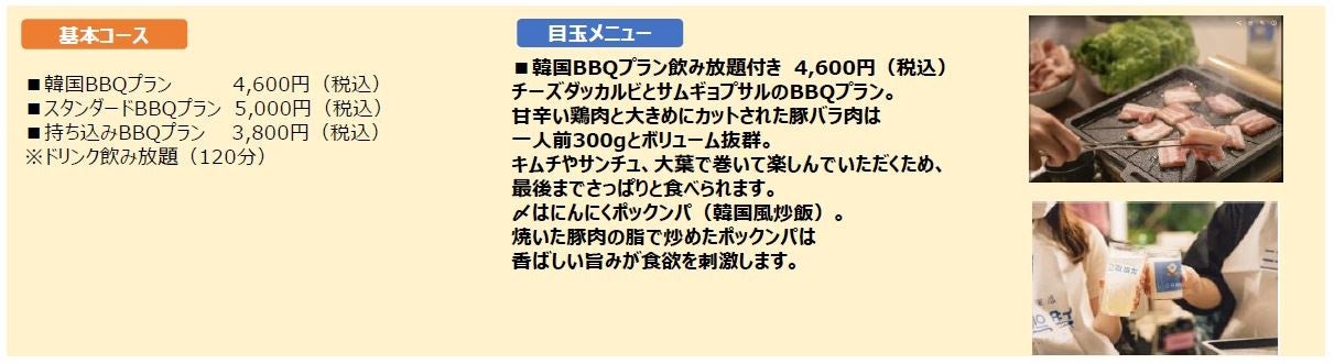 チーズダッカルビとサムギョプサルの韓国BBQプランに加えスタンダードBBQプランも追加され、より満足感のあるメニューとなっています。ドリンクは10種類のシロップで作るソジュサワー、5種類のマッコリ、お茶割り、スパークリングワインなど自由な組み合わせをロゴ入りオリジナルグラスでお楽しみください。また、飲み放題のみの食材持ち込みBBQプランもご用意しています。