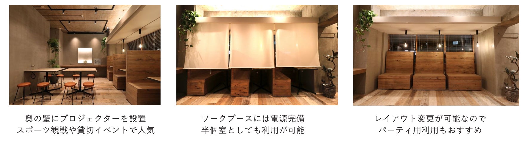 会話や食を楽しんでいただくだけでなく、ワーカーさんにもご利用いただける半個室もあり、プロジェクターもあるのでスポーツ観戦や貸切イベントなど、さまざまなイベントに対応が可能です。