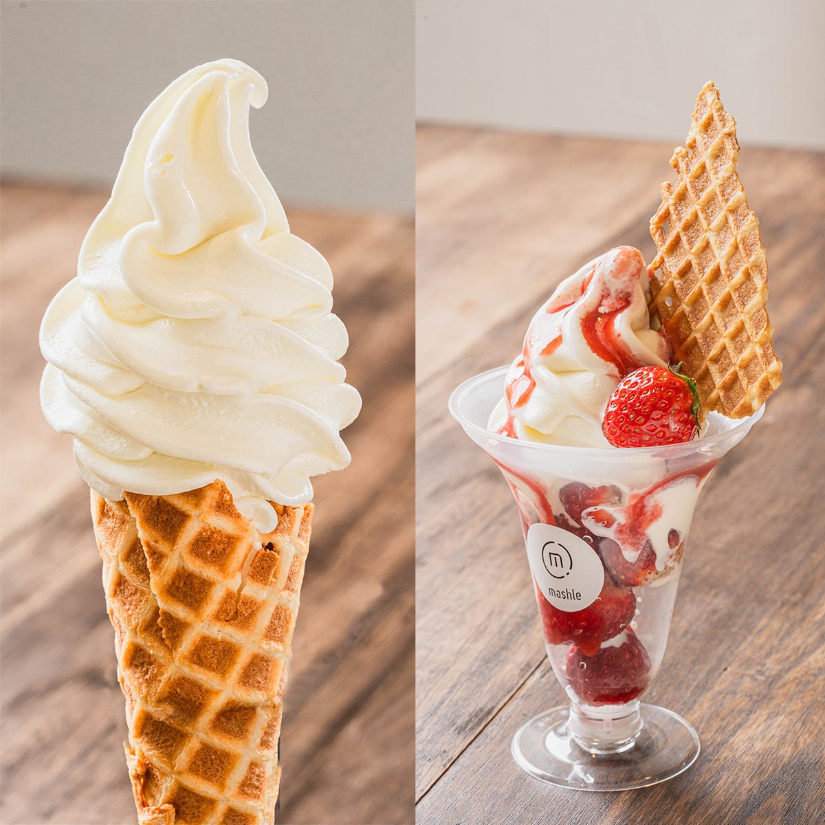 ジャージー牛乳ソフト(650円・写真左)/自然素材の菓子工房 ましゅれ