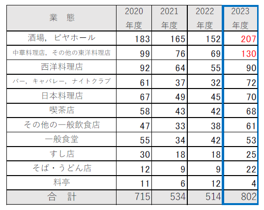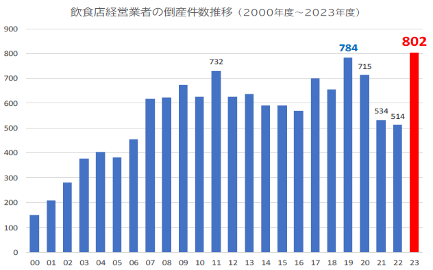 2023年度(2023年4月~2024年3月)の飲食店の倒産は、前年度比56.0%増の802件となり、2019年度(784件)を上回って過去最多となった。