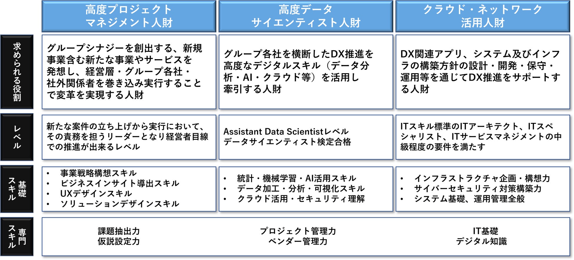 研修は高度プロジェクトマネジメント人財育成、高度データサイエンティスト人財育成、クラウド・ネットワーク活用人財育成の3つのコースに分けて行われ、それぞれ(株)アドライト(注2)、(株)データミックス(注3)およびトレノケート(株)(注4)の協力を得て実施します。また、実践力、実装力の強化を図るため、高度プロジェクトマネジメント人財育成コースと高度データサイエンティスト人財育成コースが協働して1つのトランスフォーメーション企画を生み出すプログラムの実施や、外部コンペティションへの参加も計画しており、研修後には各人財が相互協働し、グループシナジーを創出する新たな領域の事業やサービスを生み出していくことを目指します。