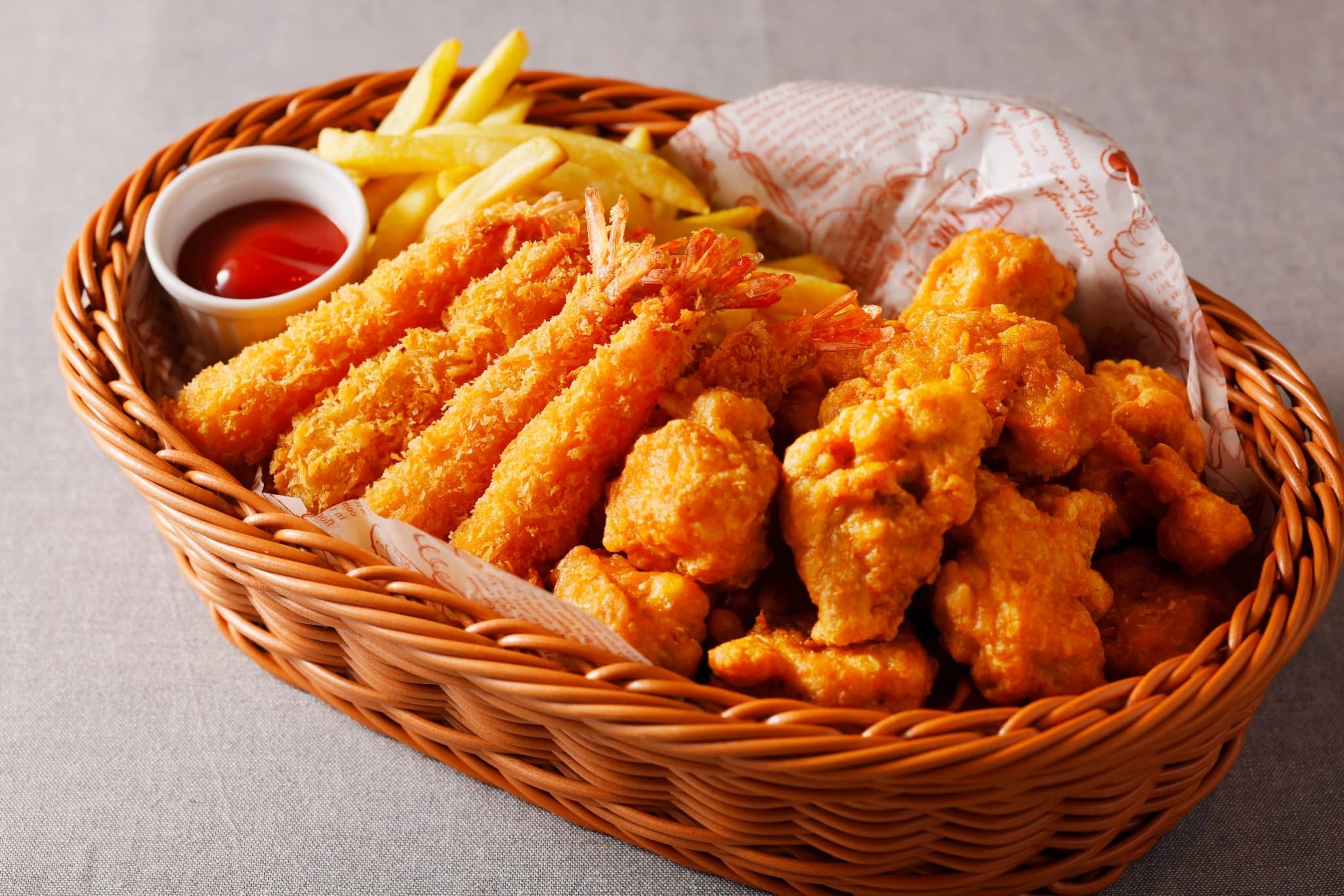 ・鶏のから揚げ ・フライドチキン ・ミニハンバーグ ・ポークウインナー ・コーンポタージュ ・エビフライ ・ももまんじゅう