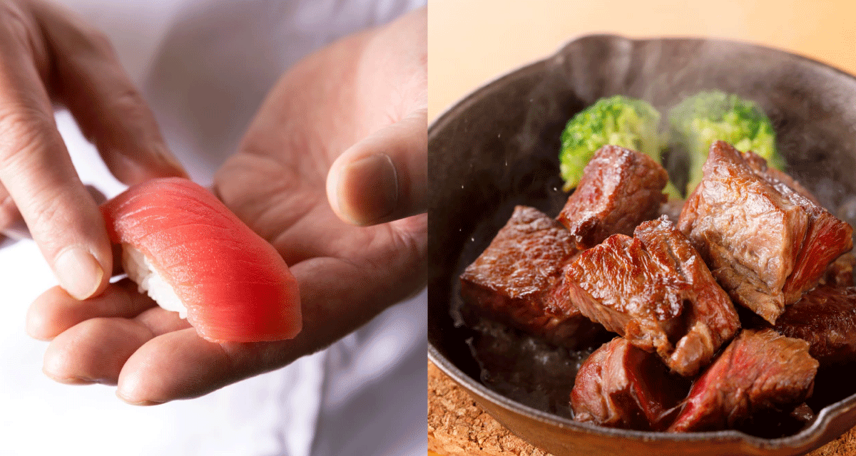 実演メニューは魚・肉・デザートで4種ご用意いたしました。魚の実演では、職人が目の前で握る「握り寿司」をご用意。マグロ、サーモンをはじめとした人気ネタ6種類の中からお好きなものをお選びいただけます。また、お肉の実演では「牛ロースステーキ」をご提供。焼きたて熱々をお召し上がりいただけます。