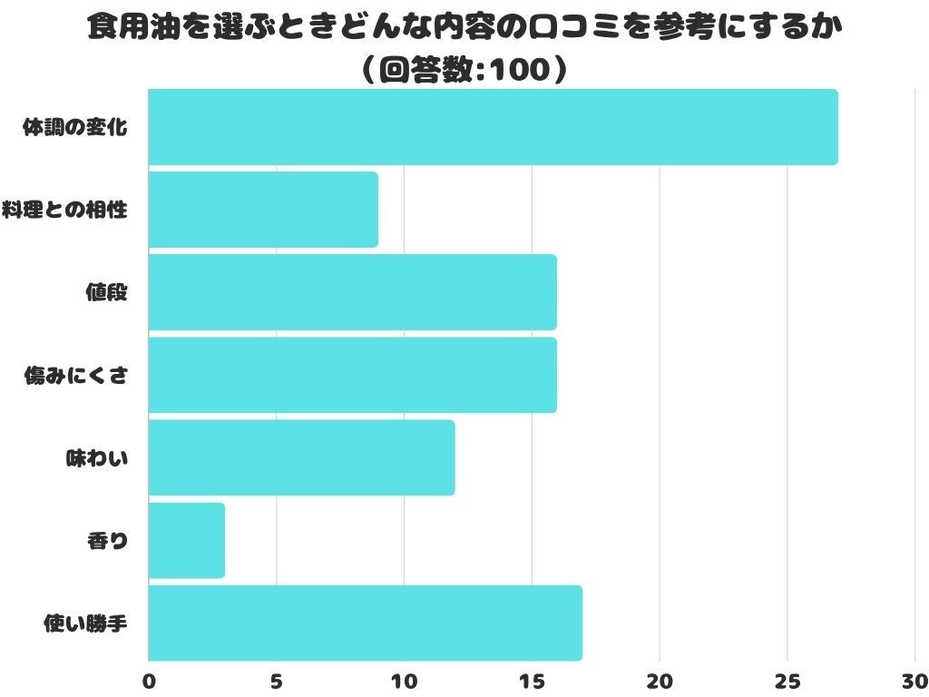 食用油のどんな内容の口コミを参考にするかをアンケートにて調査したところ、1位は「体調の変化」でした。
