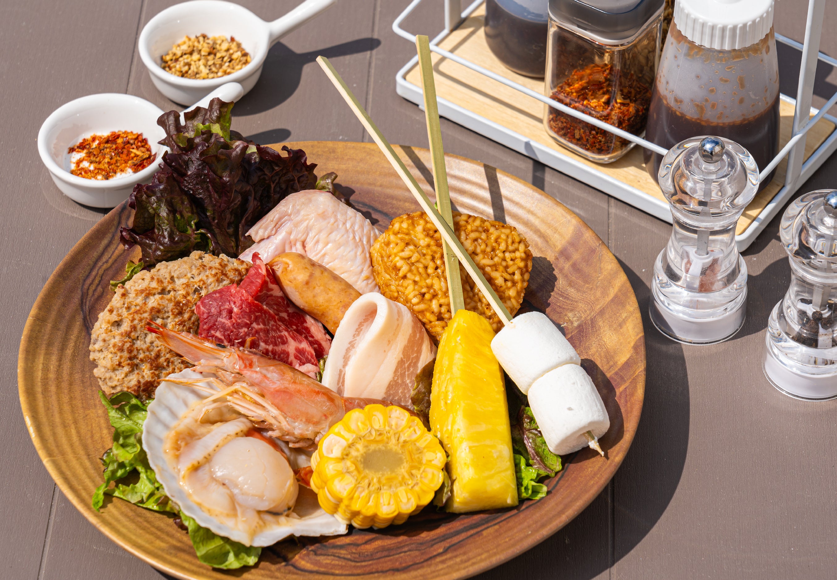 ・牛肉(カナダ産)150g・鳥手羽1本・豚バラ肉60g・ソーセージ1本・殻付きホタテ1個・有頭エビ1尾・イイダコ1杯・とうもろこし1カット・焼きおにぎり1個・パイナップル1/8本・マシュマロ2個