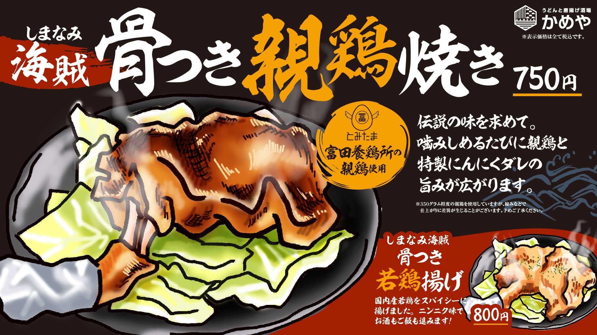 2024年4月1日(月) しまなみ温泉 喜助の湯内のレストランエリアの『うどんと唐揚げ酒場 かめや 今治駅前店』がサウナ後にぴったりな新メニュー 海賊骨付き親鶏焼きを新発売!