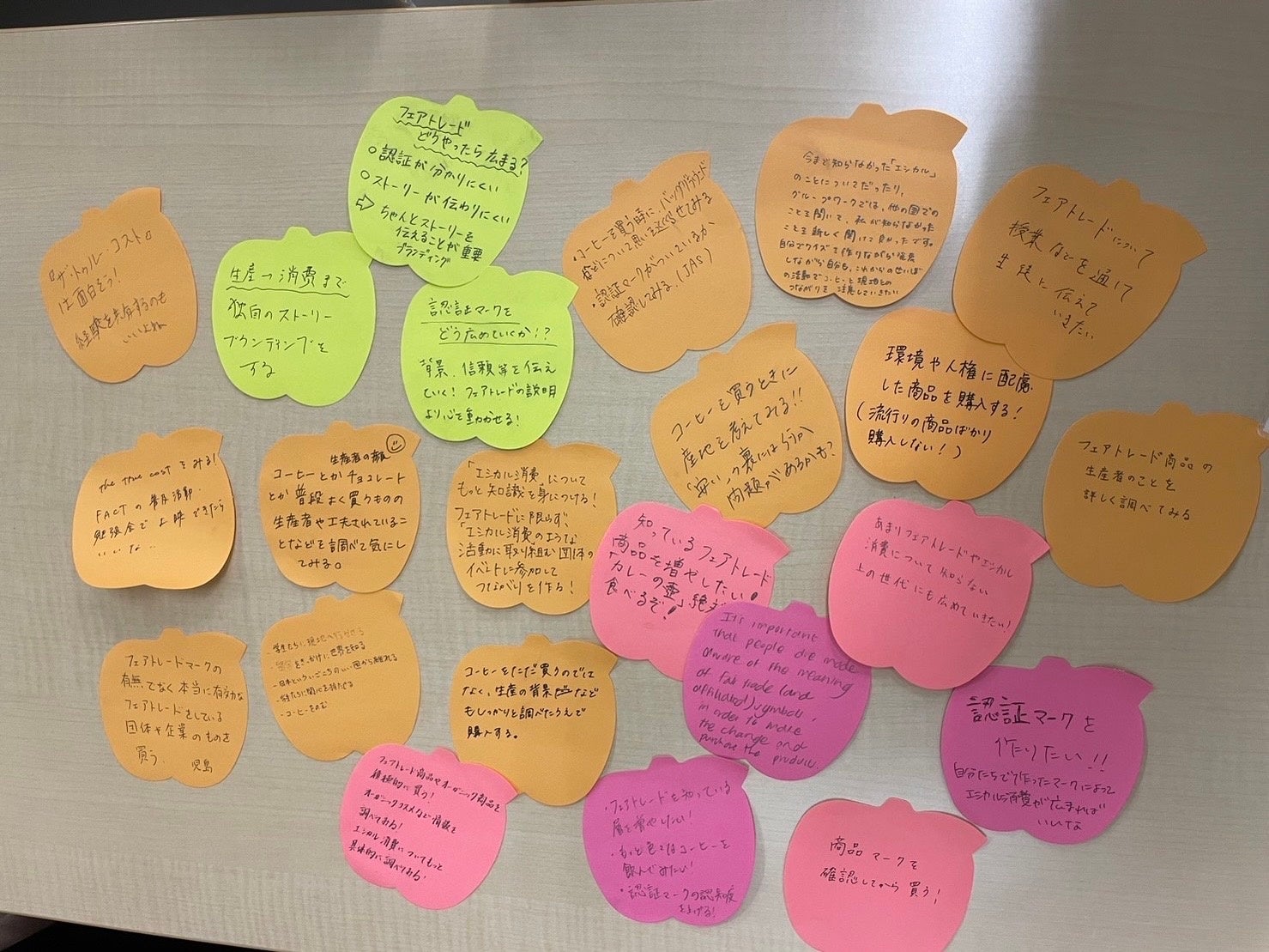 イベントの最後に、今後実践したいアクションを付箋に書いてもらいました。「商品を買う前に生産者のことに意識を向ける」「もっと調べたい」「フェアトレードを広めたい」などの意見が寄せられました。イベントに対するGreen Sophiaとしての思いを実現できたのではないかと感じています。