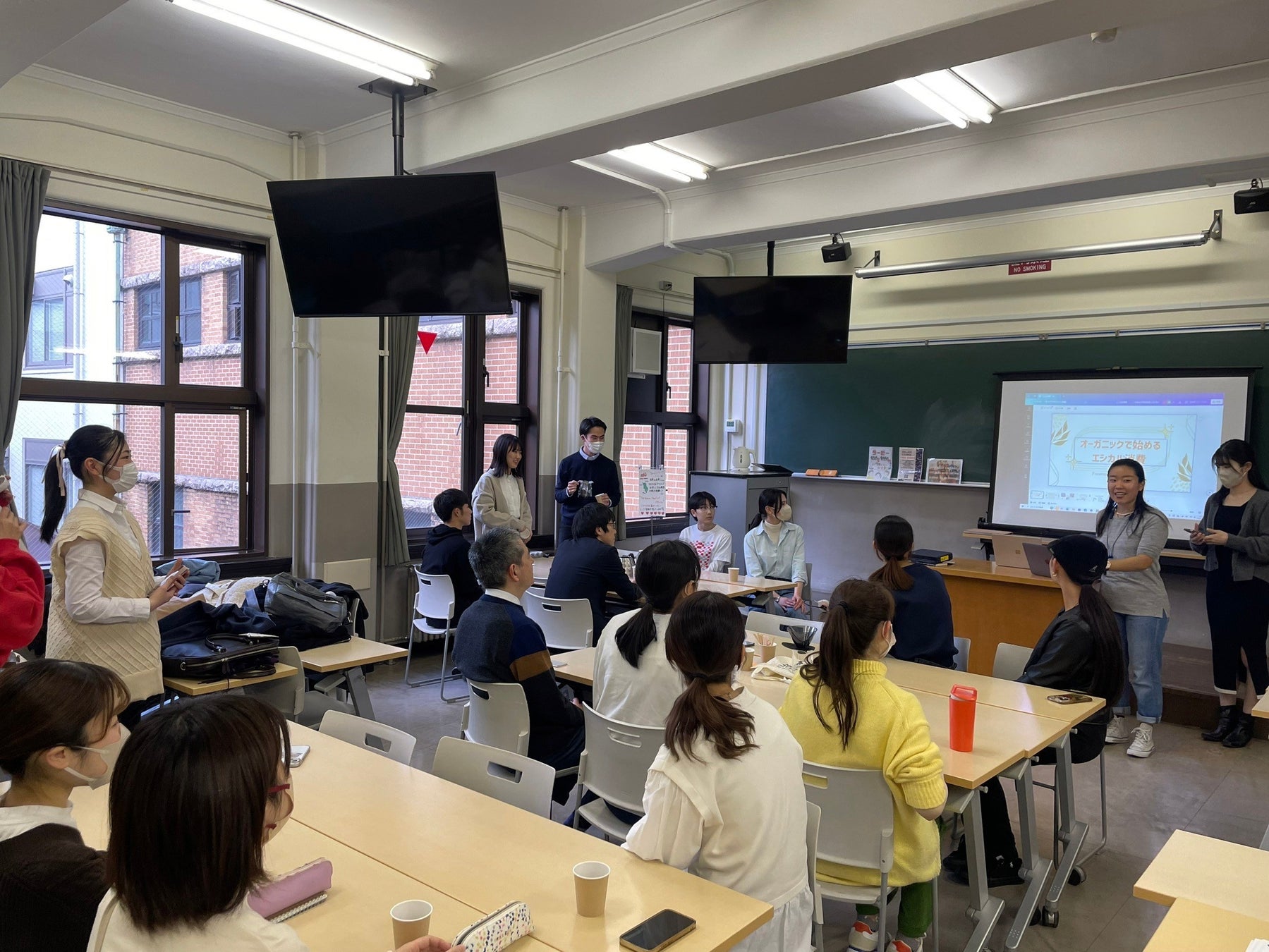 Green Sophiaのメンバーによるプレゼンで、エシカルについての簡単なレクチャーをしました。そもそもエシカルとは何か、エシカル消費の具体的な行動例、認証マークの紹介などエシカルの基本的な知識をお伝えしました。