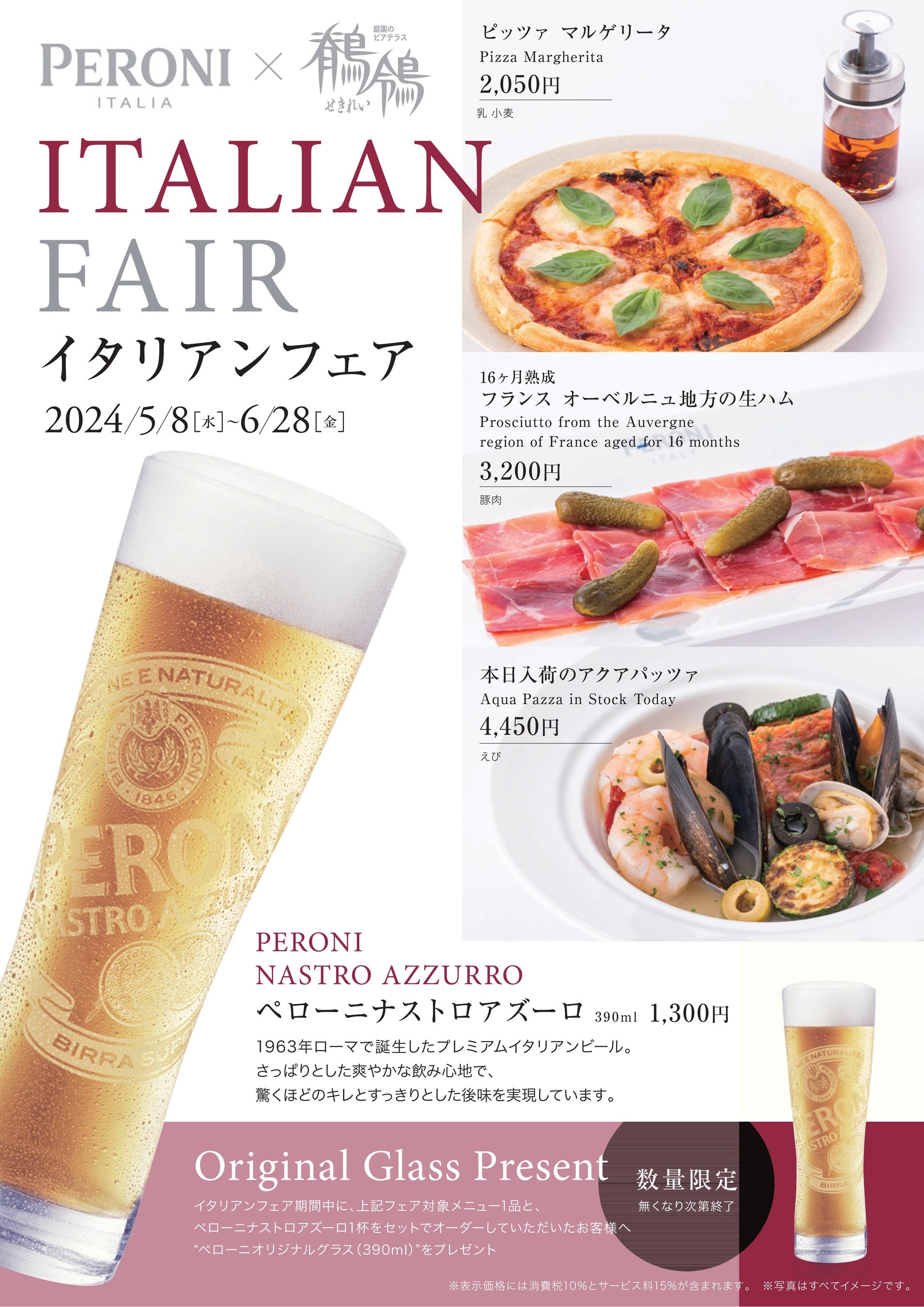 ビアテラス「鶺鴒」では、5月8日(水)から6月28日(金)まで、イタリアンビールやピッツァマルゲリータ、アクアパッツァなど、イタリア料理をお愉しみいただける「イタリアンフェア」を開催いたします。