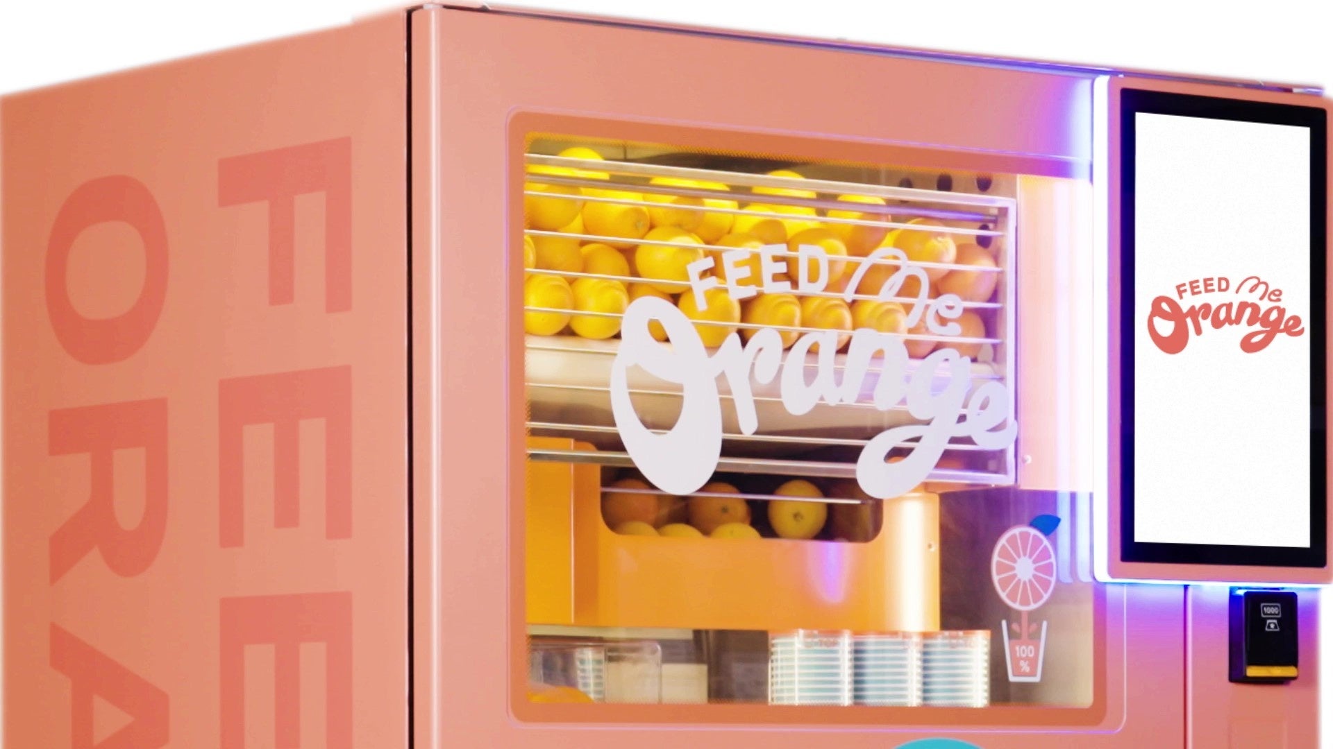 オレンジジュースができるまでの工程をガラス越しに覗きながら楽しめる、エンターテインメント性を兼ね備えた新世代の自動販売機です。使用するオレンジは季節によって産地・品種が変わるため、一年を通して様々な味わいのオレンジジュースをお愉しみいただけます。