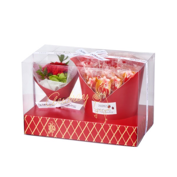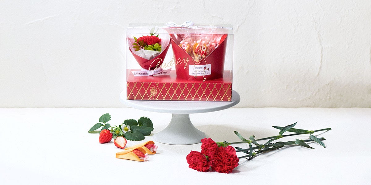 オードリーでは、人気の花束型のいちごのお菓子「グレイシア」と母の日の定番“カーネーション”がセットになった特別商品「Mother’s Day Gift Box」と「グレイシアブーケBOX」を発売いたします。「Mother’s Day Gift Box」は、花束の形をしたグレイシアと、カーネーションのプリザーブドフラワーを詰め合わせています。