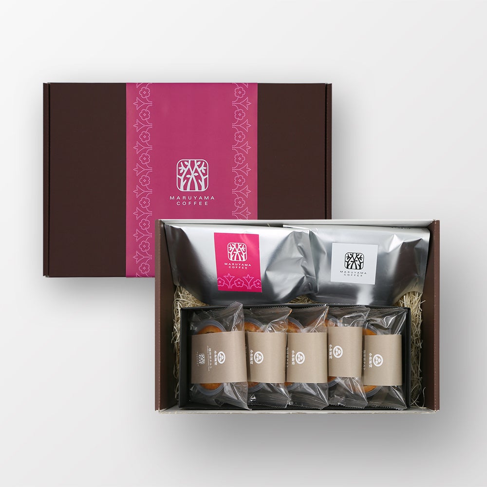 フラワーブーケブレンドと定番の丸山珈琲のブレンド、珈琲栗タルトを詰め合わせたギフトセットです。