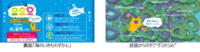 裏面には”ねこングの海中調査“としてパッケージと連動したそれぞれの海の世界を紹介する「海のいきものずかん」を記載。いきものたちの知られざる生態について書かれており、親子の会話が弾む意外な豆知識を紹介しています。さらにパーティーパックでは、底面から中のピュレリングをのぞくと”グミのうみ“を眺めることができる仕掛けを施しています。