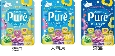 特徴 :小さなお子様でも食べやすい、海の世界をモチーフにしたハートのリング型ピュレグミの3種のフルーツ×ソーダ味