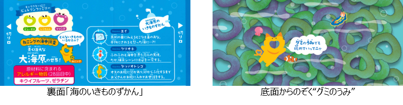 裏面には”ねこングの海中調査“としてパッケージと連動したそれぞれの海の世界を紹介する「海のいきものずかん」を記載。いきものたちの知られざる生態について書かれており、親子の会話が弾む意外な豆知識を紹介しています。さらにパーティーパックでは、底面から中のピュレリングをのぞくと”グミのうみ“を眺めることができる仕掛けを施しています。
