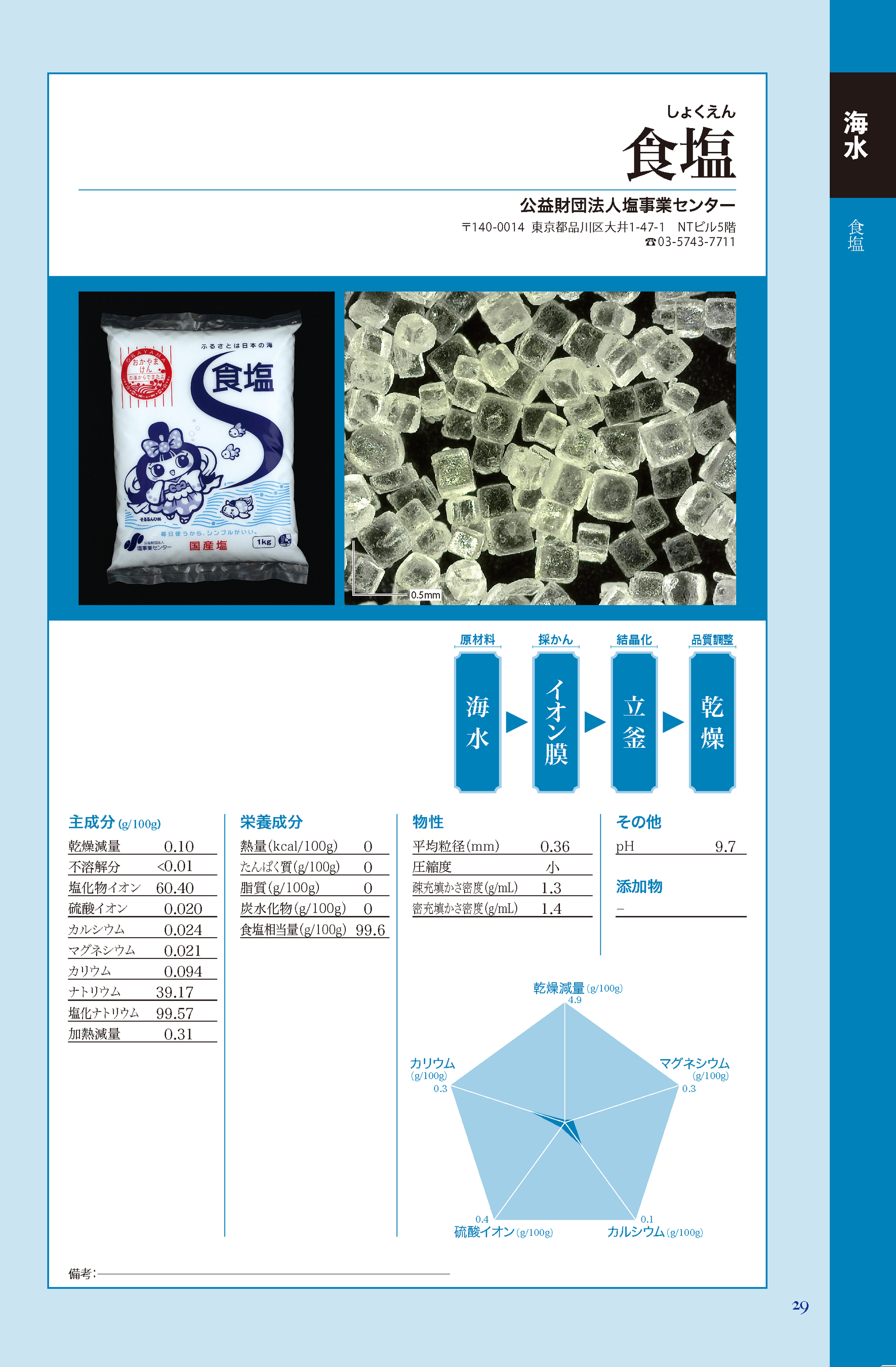 現在、塩は多種多様な商品が販売されていますが、この書籍ではそれぞれの商品について、パッケージや粒の形がわかる拡大写真や成分の分析データもあわせて掲載しており、塩を選ぶとき、塩を使うときなどにお役立ちいただける内容になっています。研究者や食品・飲料業界の方だけでなく、塩に興味がある全ての方にお勧めする一冊です。