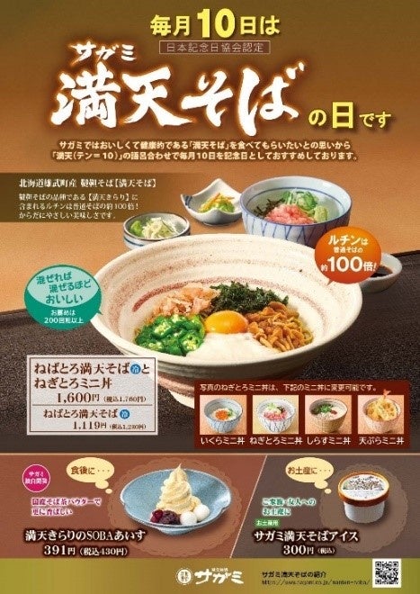 サガミでは、 「北海道雄武町産韃靼そば」の一種「満天きらり」を使用した、おいしく健康的である「満天そば」を食べてもらいたい思いから「満天(テン=10)」の語呂合わせで毎月10日を記念日として日本記念日協会より認定されました。また2024年4月9日のメニュー改定より、満天そばメニューの拡充も行い、より多くの皆様に「おいしさ」と「健康」をお届けし、「おいしい“ね”」の輪を広げてまいります。