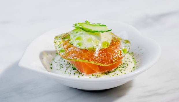 サーモンコンフィとアスパラガス 白ワインソース 抹茶とヨーグルト パセリのジュレ