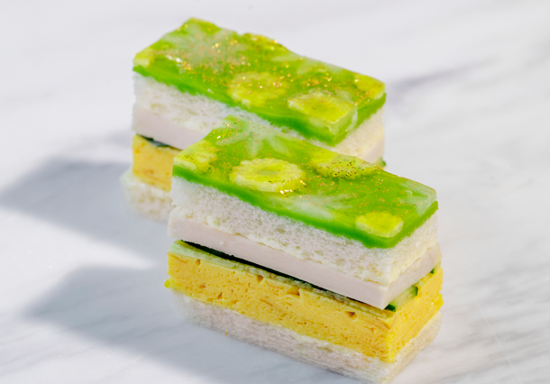 鶏胸肉と出汁巻き玉子のサンドイッチ グリーンピースピューレとサフランジュレ