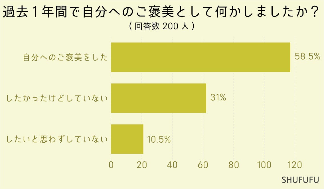 過去1年間で自分へのご褒美として何かしましたか?の問いに対して最も多かったのが「自分へのご褒美をした(58.5%)」でした。 次いで「したかったけどしていない(31%)」「したいと思わずしていない(10.5%)」という結果でした。 ご褒美をしたいと思っていない人が10人に1人の割合でいらっしゃいました。