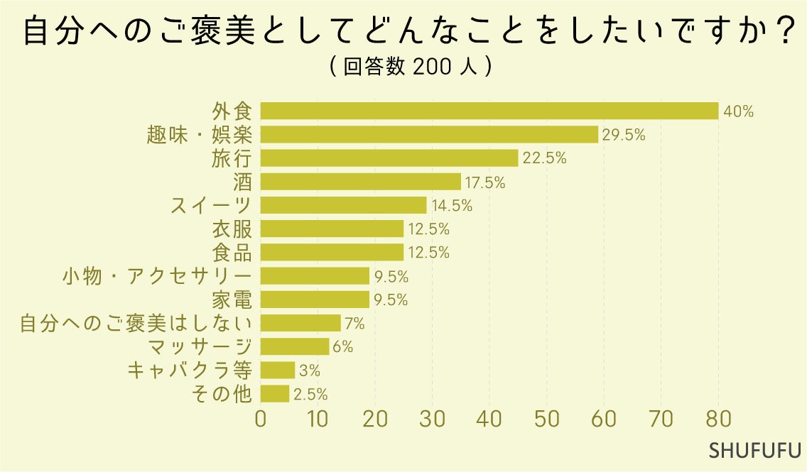 自分へのご褒美としてしたいことを尋ねたところ、1位は「外食(40%)」、2位「趣味・娯楽(29.5%)」となりました。美味しいものを食べることは気軽に満足できるご褒美ですから、回答数が高いのも頷けます。