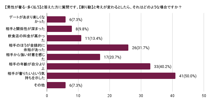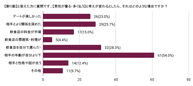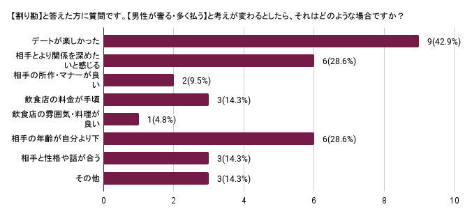 また、20代男性で「奢ることが当たり前だと考える」男性は21.4%にとどまり、「男性が奢る・多く払う」と考える男性の理由にも変化が見受けられます。