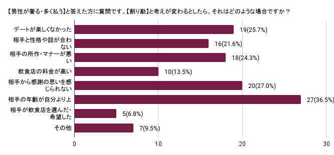 「男性が奢る・多く払う」派と「割り勘」派の男性が他方に意見を変えるポイントは、それぞれ「相手の年齢・態度」と「デートの満足度・相手の年齢」が多いことがわかります。