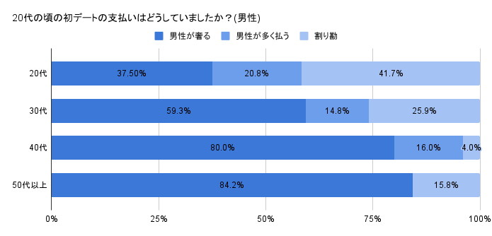 世代別に男性の初デートの支払い方を比較すると、世代とともに「奢る」と答えた男性の割合は増加傾向にある一方、「割り勘」と答えた男性の割合は減少傾向にあることがわかります。