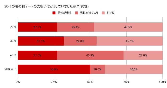 世代が若くなるにつれて、20代の頃の支払いは「割り勘」と答えた女性の割合は増加傾向にありますが、「割り勘」と答えた20代(47.5%)と60代(40.0%)の差はわずか7.5%にとどまります。