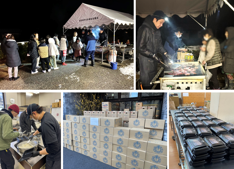2024年1月26日・27日、KINTANスタッフ総勢8名は、能登半島地震の被災地である石川県七尾市の能登島生涯センターを拠点に、キッチンをお借りし、焼き台を設置、KINTANの黒毛和牛ロース&赤身の焼肉弁当1295食と山梨県丹波山村からの支援物資である飲料水“雲取りのしずく”、田野屋酒販様からの支援物資“FUJIミネラル”、サッポロビール様からの支援物資“熊本茶”を提供いたしました。