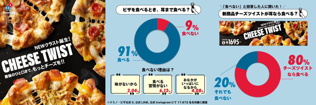 新生活が始まり、人と集まる機会も多くなってくるこの季節。普段、「ピザ耳」を残す派の方にも、「ピザ耳」を食べる派の方にも、ドミノ・ピザが自信をもってご提案する「チーズツイスト」を、耳まで余すことなくお楽しみいただき、「ピザ耳を食べる習慣」をつけてみてはいかがでしょうか。