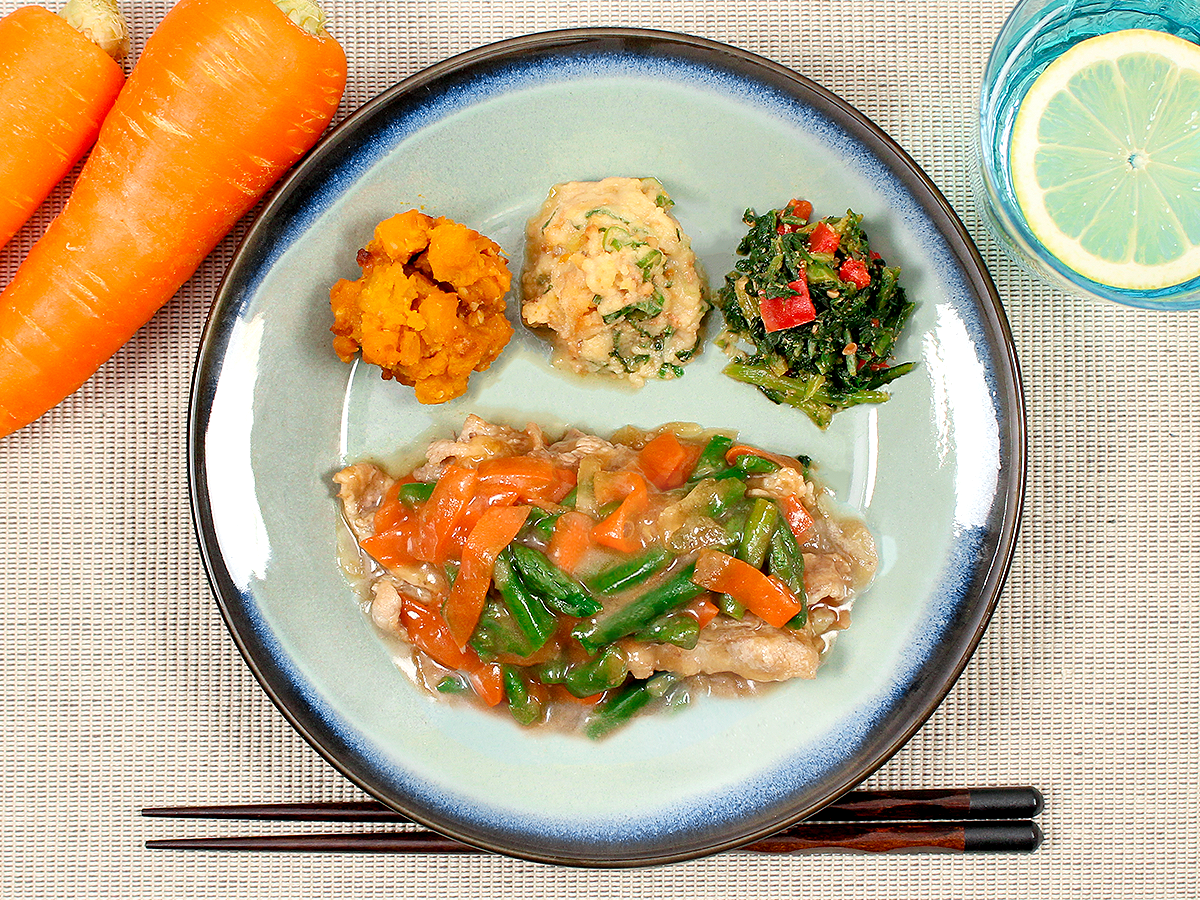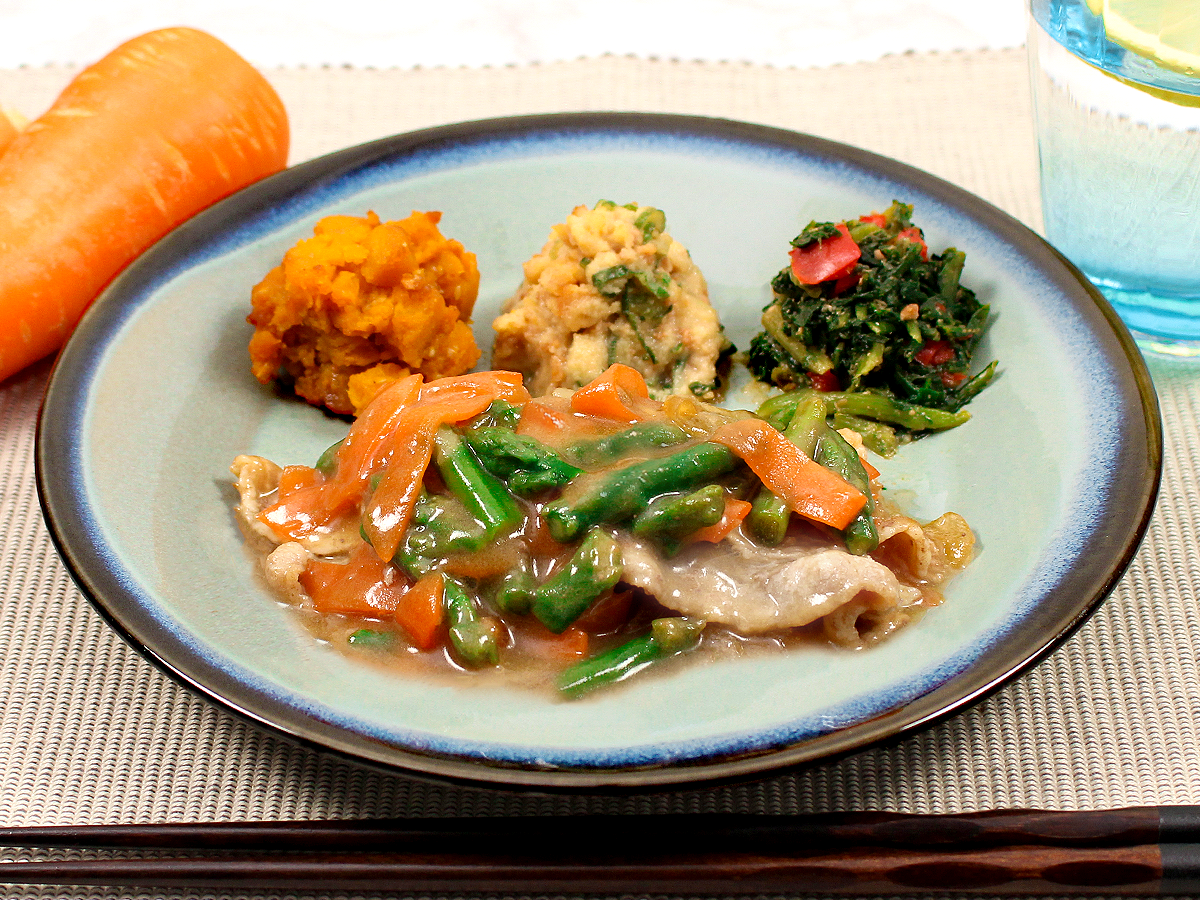 副菜は、かぼちゃのあえもの、肉そぼろポテト、春菊のごまあえです。