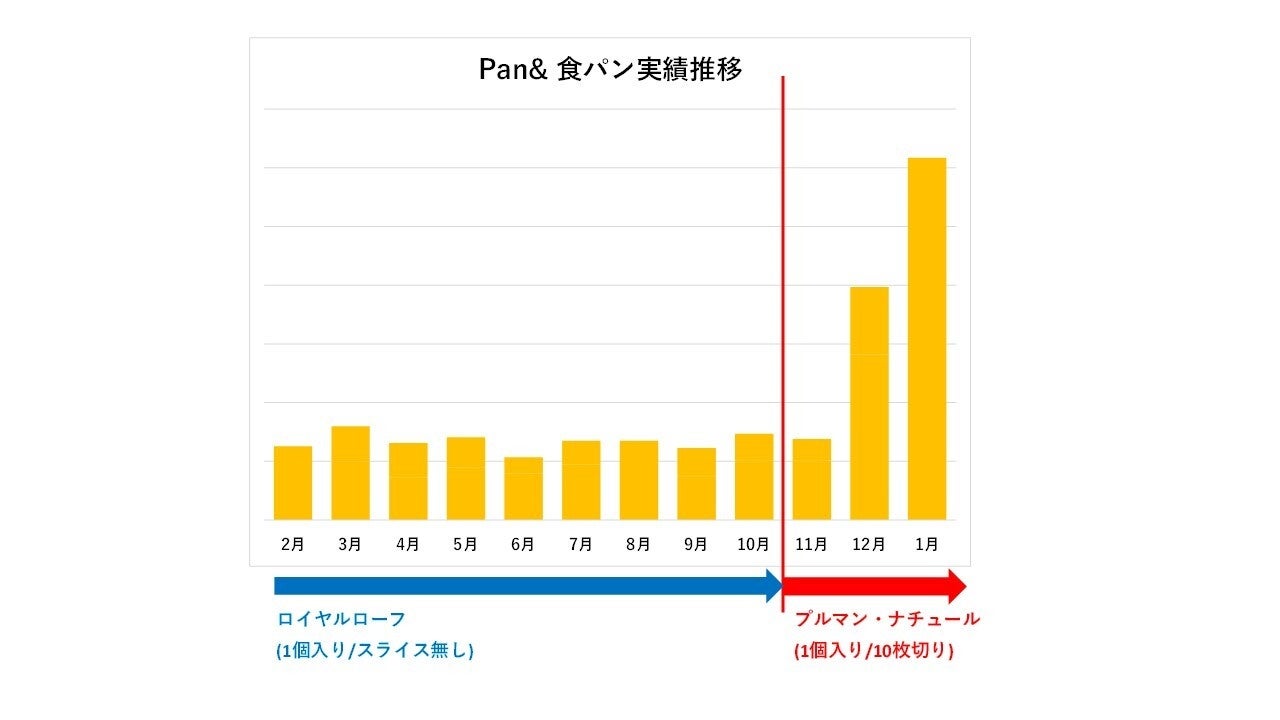 プルマンシリーズは、国産小麦を100%使用したミニサイズの角食パン。以前は、スライス無しの商品として販売しておりましたが、必要な分だけ取り出せるようスライスして販売したところ、販売数が約4倍(2023年10月-2024年1月対比)伸長しました。