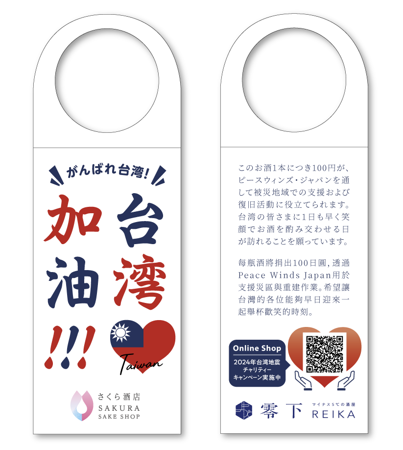 また、弊社は現在台湾に多くの日本酒を輸出させていただいていることや、台湾出身の親を持つスタッフも在籍していることなどから、会社としても繋がりの深い台湾の方々を今こそ支援しようと決意しました。オンラインショップ「零下」、業務用卸、海外輸出の全ての取引を対象とし、ご注文いただいた全てのお酒1本に付き100円を台湾に寄付します。そして、思いやりと支援の輪を広げるために「台湾加油!!!」の限定首掛けを商品に付け、SNS等での拡散を呼びかけます。