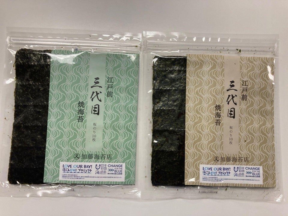 この伝統ある江戸前海苔を後世に残すことができるかどうかは、これからの私たちの生活や行動次第です。今回本プロジェクトの趣旨に賛同いただいた千葉県市川市南行徳の加藤海苔店とのコラボレーションで海と日本プロジェクト・CHANGE FOR THE BLUEとLOVE OUR BAY! 海ごみゼロ! プロジェクトのロゴ、そして海洋ごみ削減のメッセージを入れた商品を2種類、3月下旬より販売開始しました。この商品を通じて本プロジェクトの活動と江戸前海苔の危機を多くの人に知っていただくことで、海洋ごみ削減と日本の伝統を後世へ残すことへのきっかけになることを願っています。