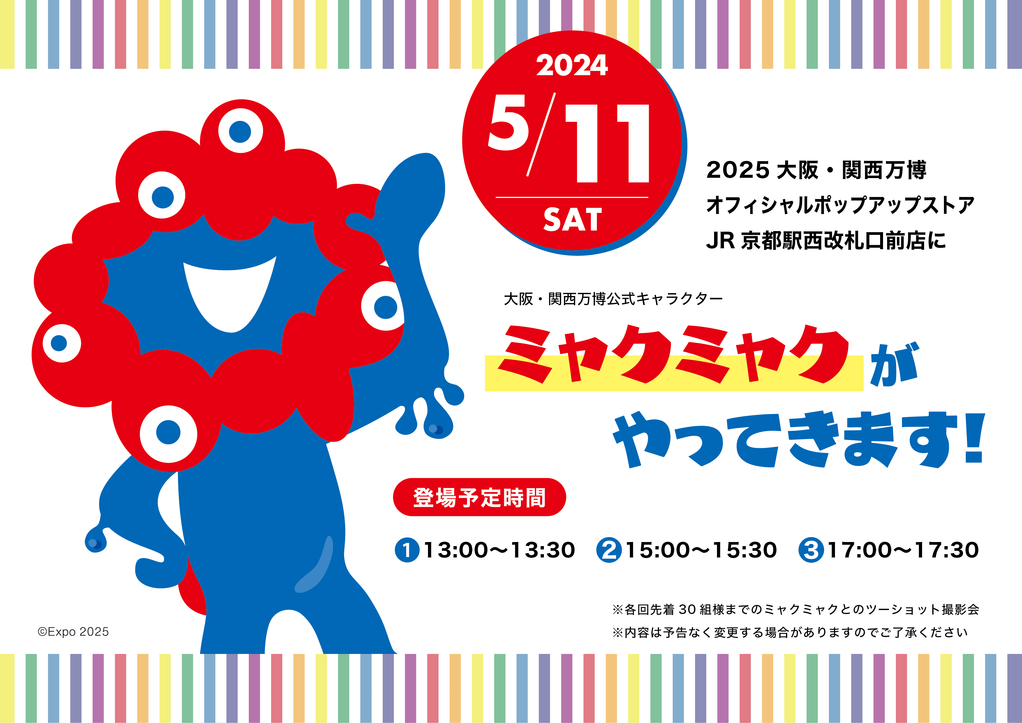 2025大阪・関西万博オフィシャルポップアップストア JR京都駅西改札口前店に、大阪・関西万博公式キャラクターのミャクミャクがやってきます!ミャクミャクと一緒にツーショット写真を撮影しよう!
