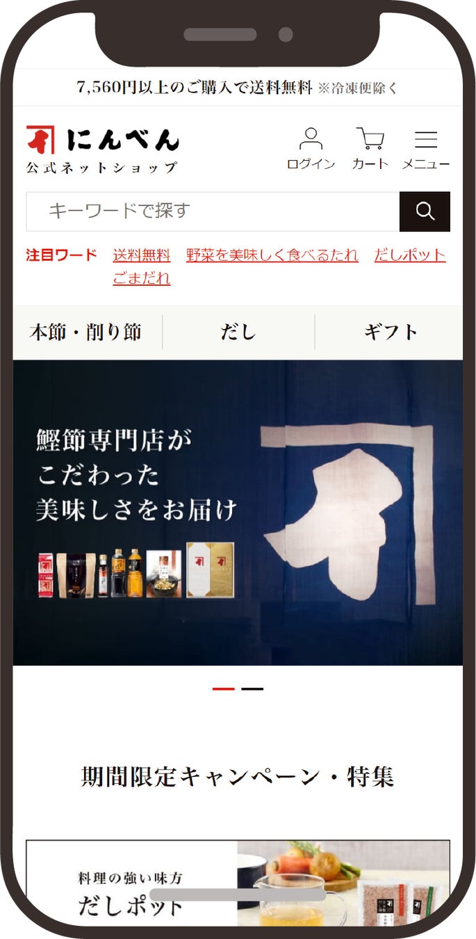 「にんべんネットショップ」は、2010年より自社運営のECショップとしてオープンし、広く全国のお客様に鰹節やだしの価値を生かした商品を提案、提供しています。通販限定デザインの「だしポット」やフレッシュパック「本枯鰹節物語」など、本枯鰹節関連の商品が人気です。