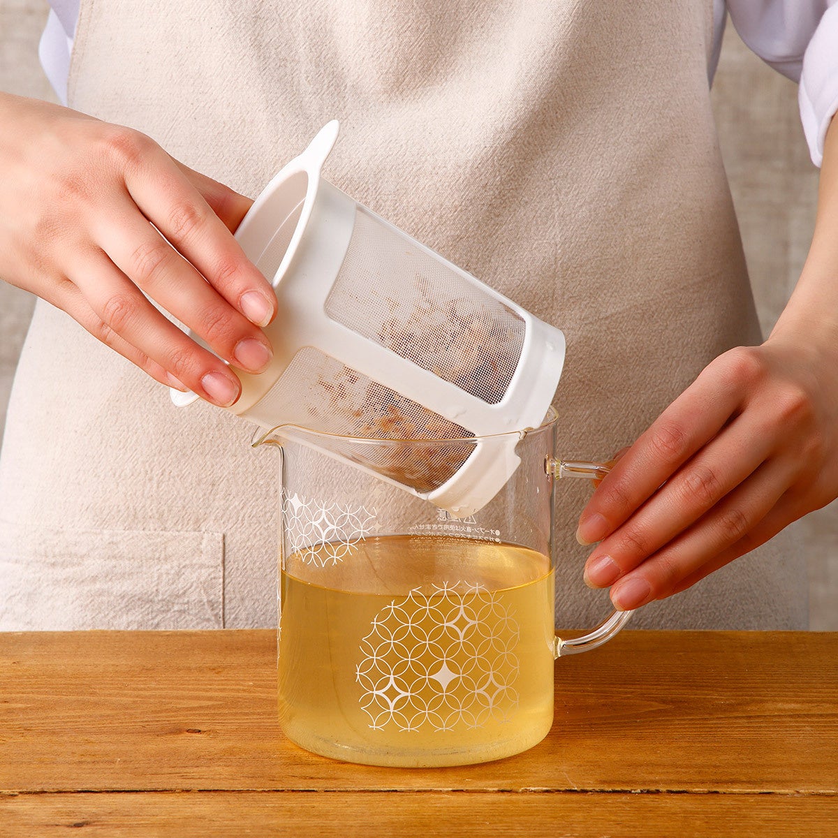 思わず誰かに薦めたくなる商品として、利用者の口コミでにんべんネットショップの人気商品になった【通販限定デザイン】だしポットに、贈答向けギフトセットができました。水とかつお節を入れて、電子レンジでチンするだけで、本格だしがひけます。ポットの底まで届く、深いこし器が、おいしいだしをひくポイントです。