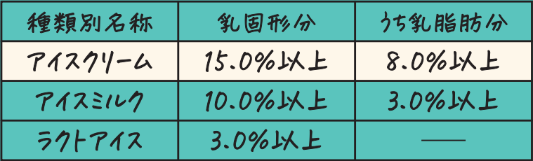 乳固形分を15%以上、そのうち乳脂肪分を8.0%以上含むものを「アイスクリーム」といいます。「種類別アイスクリーム」は乳成分が多く含まれており、一般的にクリーミーな味わいをお楽しみいただけます。