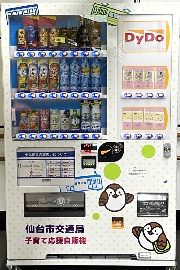 また、本自販機は、仙台市交通局のすずめのキャラクターを施し、ご利用されるお客様により親しんでいただきやすいデザインとしており、飲料や紙おむつを購入する以外の楽しみも提供いたします。